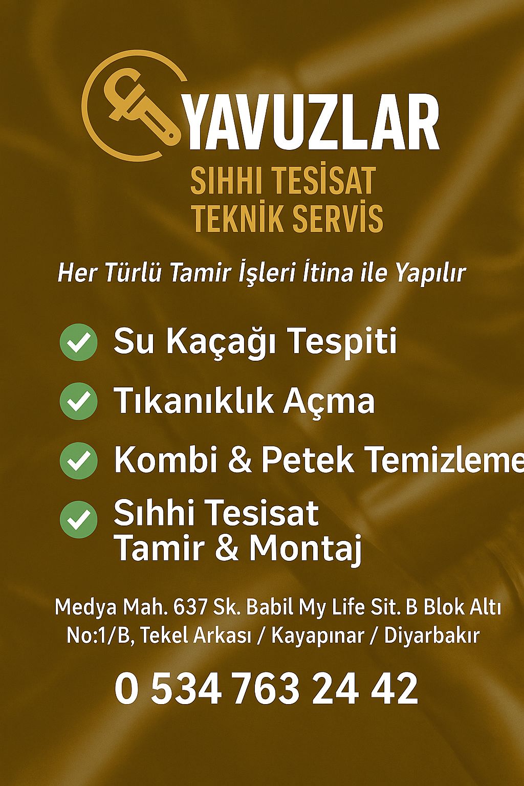 Telefon numaramız, WhatsApp hattımız veya web sitemizdeki iletişim formu üzerinden Yavuzlar Sıhhı Tesisat'a ulaşabilirsiniz. Diyarbakır içindeki adresinizi ve sorununuzu kısaca iletmeniz, hızlıca servis planlamamız için yeterlidir.